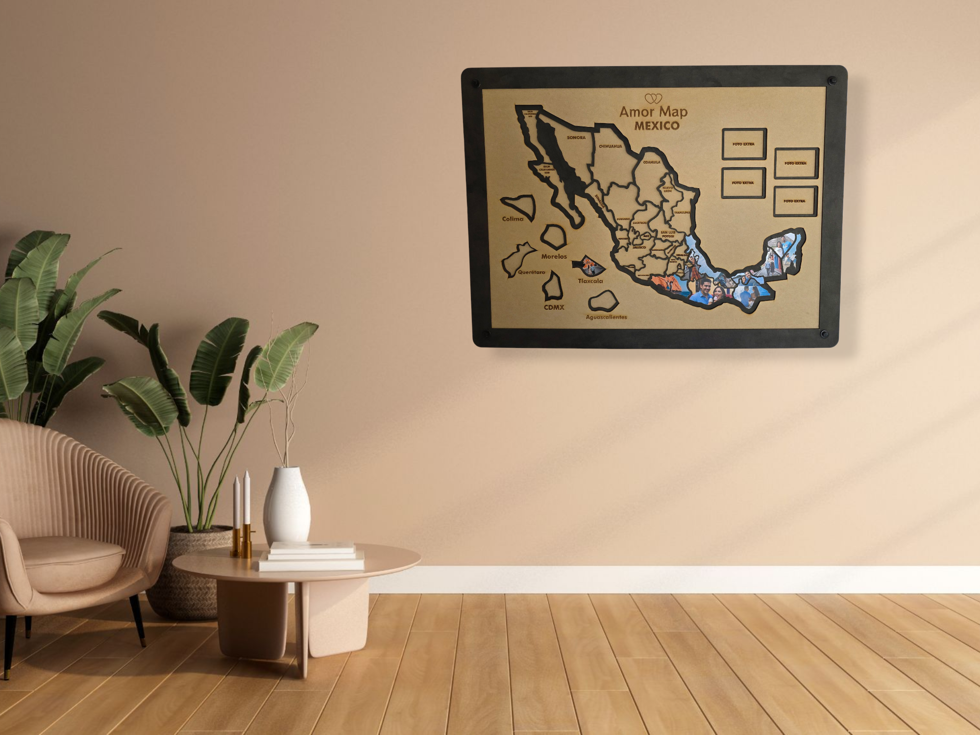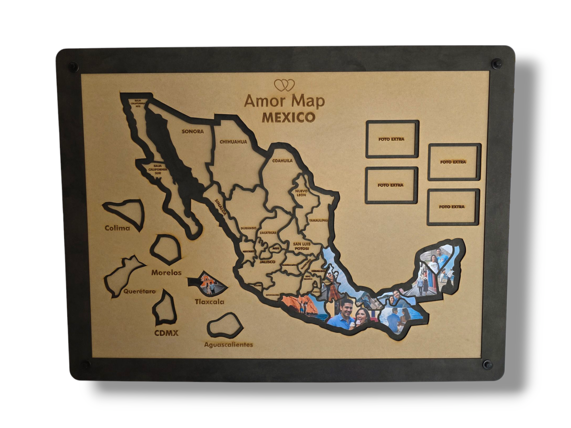 Con tu mapa te llegara un codigo QR que dirige a una plantilla en Canva, ahi podras agregar tus fotos y de forma automatica se recortaran a la forma del estado o ciudad.